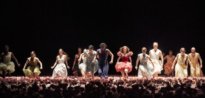 As it opens, though, you wouldn’t suspect this at all. The stage is covered with almost 8,000 silk carnations (nelken means carnation in German) standing upright and every shade of pink as the company arrives in evening dress to sit on their chairs and admire them. This sense of calm will not last. There are four Alsatian dogs that strain on their leashes barking. Dancers rub chopped onion on to their faces or drop earth over their heads. Four stuntmen leap off towers of scaffolding. A woman is force fed oranges despite her protests. There is ritualised humiliation. It is not comfortable.