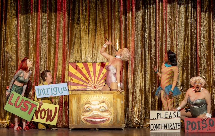 Before a note is sung, over the overture we’re drawn in through a delicious opening montage: circus performers — fortune teller, sword-swallower, strongman — emerge from a magician’s box carrying title cards that spell out the plot with increasingly humorous results. It sets the tone perfectly, this silent circus chorus adding texture throughout the performance in a rich, colourful tableau.