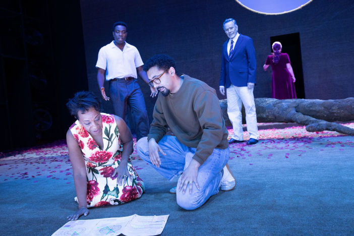 All the action takes place outside the Keller’s house and is all the more resonant due to Versweyveld’s striking set and lighting design. Wholly without stage property, save for a ‘tree’ which is felled during the electrifying storm sequence which opens act one: a woman, whom we later know to be Joe’s wife Kate (Marianne Jean-Baptiste), holding onto the trunk for dear life. As if Miller is declaring that man can never compete with Nature, the tree lies horizontally across the stage for the duration of this suspenseful drama, while a backdrop intended to be the back of the Keller’s house features a circular portal, lit at different times to represent the sun or moon, whilst being large enough for members of the cast to appear within its opening.