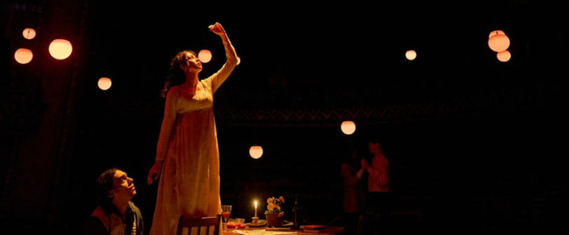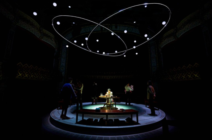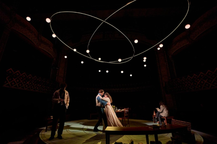 Due to this being an in-the-round production with a revolving stage, the set design by Alex Eales consists of barely more than a central table and chair, with low, encircling benches and books and other properties adding atmosphere, so too Guy Hoare’s entwined orbs of light suspended above and making reference to the scientific and mathematical topics with which the play deals. The visuals also rely heavily on the modern and period costume designs by Suzanne Cave which offer clues to the characters and allow the audience a heads up when moving between the two centuries, not least when the past and present merge.
