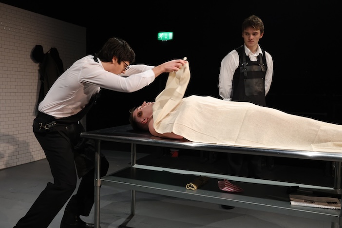It may sound rather out of keeping with the festive spirit, but the Southwark Playhouse show for early December is The Grim. The set certainly lives up to the promise of the title – a white-tiled undertaker’s surgery, with a cold steel table centre stage and a pack of painful-looking surgical implements. Strangely enough, though, with the arrival of Shaun (the new proprietor of his family’s undertaking firm) and his assistant Robert the mood quickly switches to what would now be regarded as highly inappropriate banter – the date is 1964 – and the kind of black humour you might expect from those who work in this kind of business.