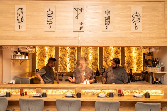 Tucked away in a corner of Marylebone and secluded from the chaos of the Edgeware Road is Junsei, a yakitori bar with a twist. I first notice this when I sit at my table and notice that, under the reception desk is a shelf or two of vinyl – yes, real old records that form the sound backdrop with everything from Japanese City Pop to soul. It’s all part of the tradition of the Tokyo “listening bar” where customers enjoy curated music (there are DJs involved in the project) alongside skewers and sake.