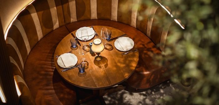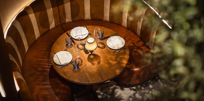 He can’t suppress his giggles as we descend, feeling rather Winslet-like sashaying down the Titanic’s central stairs, passing a statement olive tree below. And that, indeed, is indicative of the greenery about us. It’s never normally something I’d spot, but you can’t not notice it; there’s a garden wall, and each pillar and banquette is fringed with topiary – and as Larman excuses himself to the gents, I reach out to touch it.