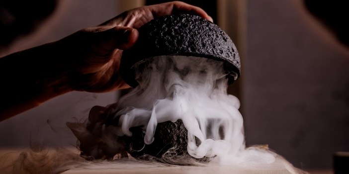 Even the tableware is carefully chosen. There’s a dark moon that splits in half to reveal a smoking tuna tartar, there are plates like molten rocks, other like half-moons. There are a series of delights: a “taco” (Leo spent some time working in Mexico) of sweet potato, caviar and sesame “for love and warmth”; creamy, sweet scallops with tahini truffle; wasabi ice cream; and, my absolute favourite and a riff on Leo’s own childhood snack (to be fair, his mother was a chef, too) that was a wondrous ball of rice, yellow-tailed tuna, yoghurt and sesame that kept exploding new surprises on the palate.