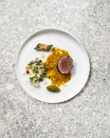 Canapes involving everything from celeriac to beetroot come in the first two courses, ‘Forever Picking’ and ‘The Rule of Three’, and then celeriac returns for the more substantial ‘Down to Earth’, where it comes paired with truffle and mushroom. Served with a divine Macon-Villages white Burgundy by the knowledgeable sommelier, it’s an impressive overture. You can tell a lot about a restaurant by the quality of its bread, and ‘Making & Breaking’, the fourth course, marries treacle-glazed sourdough with some sensational butters, of which the greatest is a chicken-infused variety.