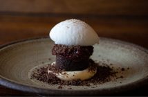 The first course arrives and we immediately forget about the gassy roars. We unwrap our Japanese sandangasane boxes (Bento boxes wrapped in a cloth) to find three trays. The top one: dry-aged beef tartare with caviar is fresh and cool and oozes umami. The two other trays contain nasturtiums from the grounds and smashed up puffed-rice crackers. It’s simple and brilliant. Crackle and spice.