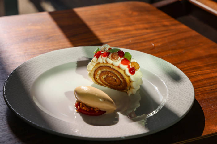 My starter of Cornish crab with brown crab meat showcased immaculate preparation and Brenan’s love of simplicity and ingredient-focussed dishes: the joy of the naturally sweet and salty shellfish enhanced with diced Pink Lady apple, dots of ponzu gel to offer sweetness and acidity, and finished with papadum-like crisps for a contrasting texture and savouriness. I continued the seaside-vibe with the stone bass main course: a fillet of milky white fish accompanied by a prawn-stuffed Hispi cabbage and shellfish bisque, a split sauce cleverly finished with caviar to offer bursts of saltiness in contrast with the natural sweetness of the prawn.