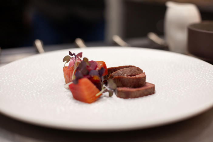A main course of local Bathurst estate venison pave with beetroot Anna was finished with bitter radicchio to offer the palette, alongside pickled blackberry, a welcome balance to the richer elements of the dish like the smoked bone marrow jus, designed to take the diner on an unexpected journey of the English countryside. The same could be said of my main course which fondly reimagined and anglicised the classic ‘canard à l’orange’ with duck breast and slow-cooked leg, accompanied by an clementine jus, brussel sprouts, plum jam and sweet potato rosti.