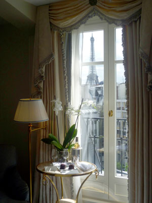 If you check in to the Royal Suite it will set you back over £15,000 a night. Imagine my amazement therefore when we stepped into the lift and the receptionist pressed button 8 for the top floor! She opened the door to a ‘deluxe’ suite, a newly refurbished room that would have impressed Marie Antoinette herself; pale blue damask furnishings, a gold and crystal chandelier above a bed so high as to almost require steps, and French windows through which could be seen, wait for it…a staggering view of the Eiffel Tower!