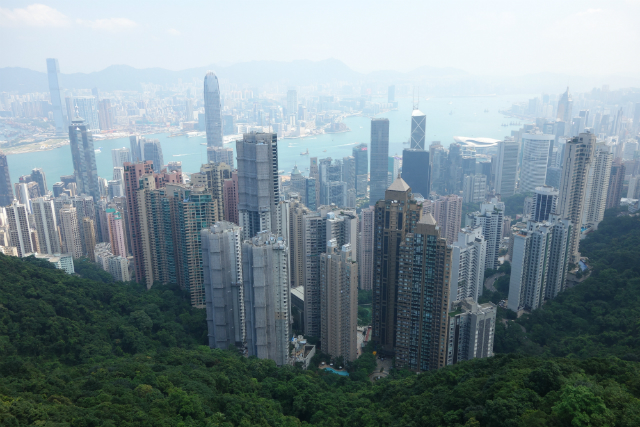 We leave early to travel to The Peak – one of this surreal city’s most memorable destinations. The journey sees us crammed into an ancient, ornate tram car, the same trams that have been running up and down the almost sheer slope for over a century and since the early days of British Colonial rule. The ascent is a bizarre experience; the skyscrapers and boats in the harbour fall away as you mount the slope at speed on this improbable gradient.